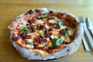 Tomat, mozzarella, salami piccante, chili, bakt paprika og chipotle majones